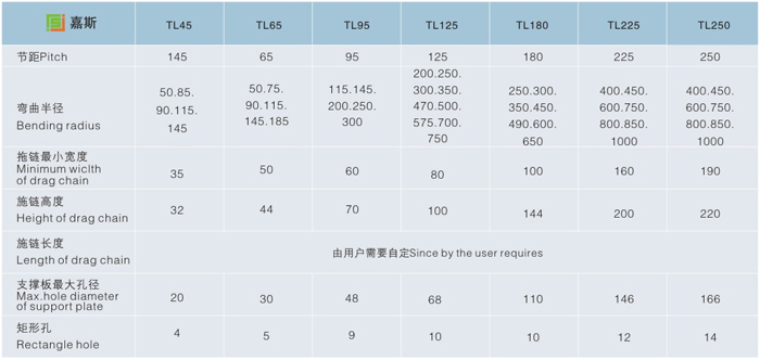JS.106005 TL型鋼制拖鏈 Tl系列拖鏈的主體是由鏈板(優(yōu)質(zhì)鋼板鍍鉻)支撐板(擠拉鋁合金)軸銷(合金鋼)等部件組成,使電纜或橡膠管與拖鏈之間不產(chǎn)生相對(duì)運(yùn)動(dòng),不產(chǎn)生扭曲變形,鏈板經(jīng)鍍鉻處理外形效果新穎,結(jié)構(gòu)合理,靈巧強(qiáng)度高,鋼性好不變形,安裝方便,使用可靠,易拆裝,尤其是本產(chǎn)品采用了高強(qiáng)度耐磨材料,合金銅為軸銷,提高了產(chǎn)品的耐磨強(qiáng)度,彎曲更靈活,阻力更小,降低了噪音,從而可保證長(zhǎng)時(shí)間使用不變形,不下垂。 由于本產(chǎn)品外觀精美,可在較大程度上增強(qiáng)機(jī)床設(shè)備的整體藝術(shù)美觀效果,增強(qiáng)我國(guó)機(jī)床、機(jī)械設(shè)備在市場(chǎng)的競(jìng)爭(zhēng)能力。 1.拖鏈可適應(yīng)移動(dòng)速度40米/分。 2.拖鏈在移動(dòng)速度時(shí),噪聲聲壓級(jí)不大于68分貝。 3.拖鏈安全使用壽命不小于100萬(wàn)次(往復(fù))。