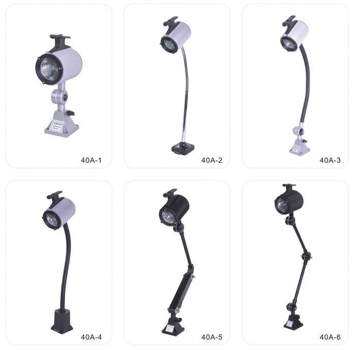 JS.109001 40A系列工作燈 40A-1工作燈采用新光源鹵鎢燈泡,光線柔和,聚光性好,適用各中小型機床,數(shù)控機床,鉆銑床、組合機床及其它設備的照明,并具有防水、防爆、防侵蝕等優(yōu)點。 40A-2、-3、-4工作燈底座350°旋轉(zhuǎn),照射角度可任意選擇,聚光效果好。